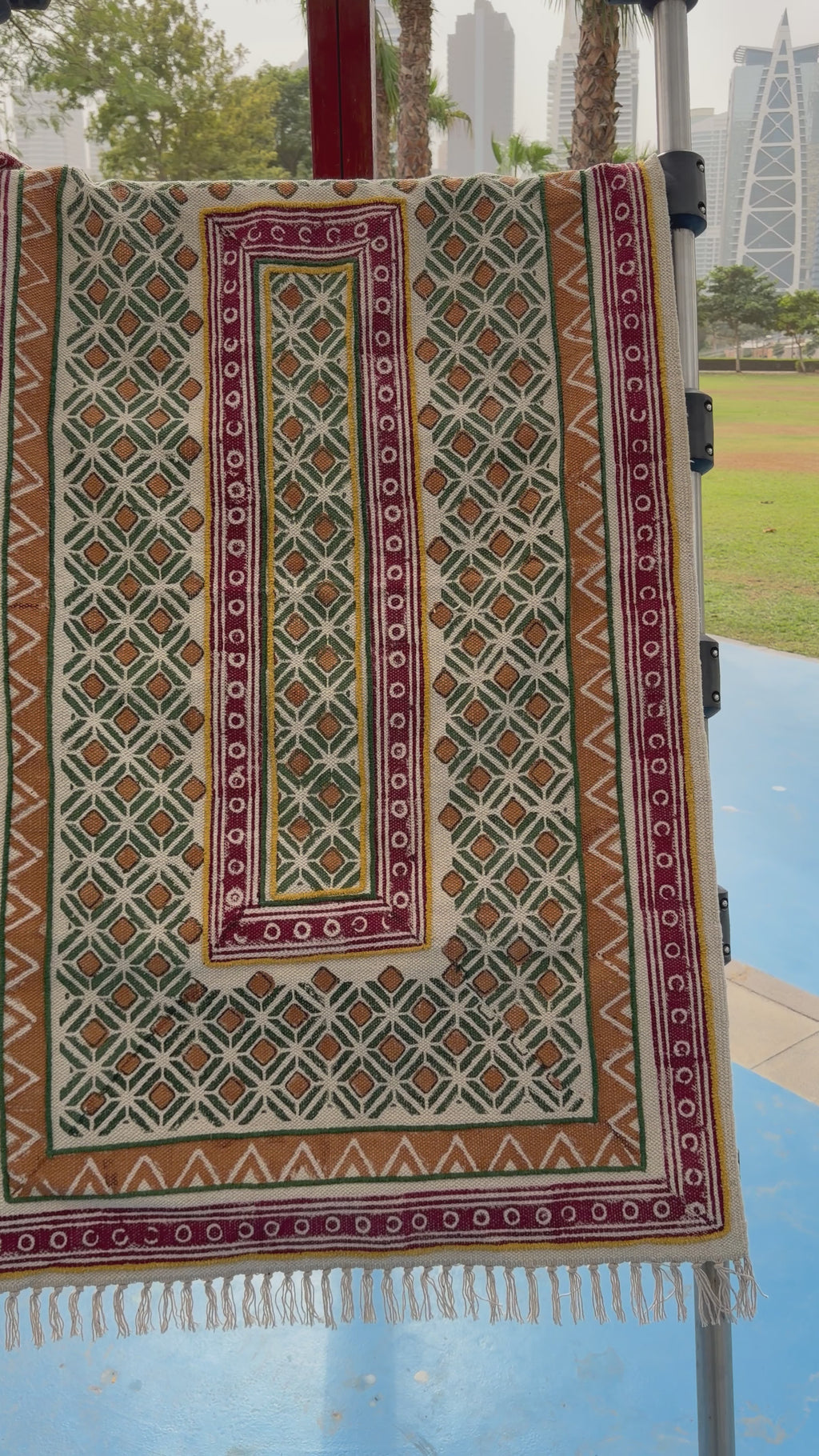 Add a touch of artisanal charm to your space with this handmade dhurrie, featuring exquisite hand block printing and delicate hand embroidery. Crafted from high-quality cotton, this versatile rug is perfect for your room, drawing area, balcony, or garden. Its intricate patterns and vibrant colors bring warmth and elegance, while the durable weave ensures long-lasting use. Whether you’re styling an indoor space or an outdoor nook, this dhurrie is a perfect blend of tradition and contemporary aesthetics.